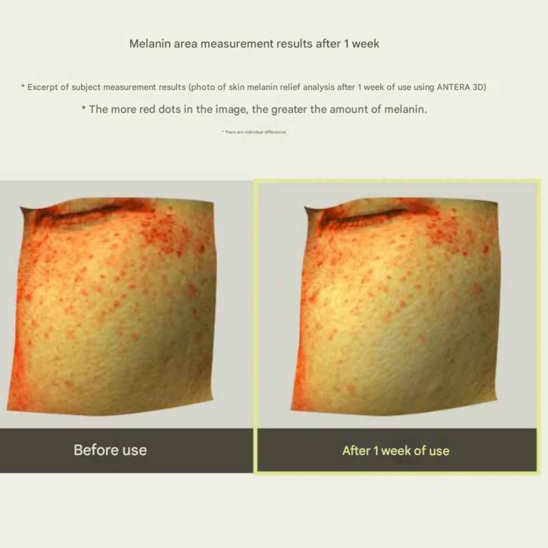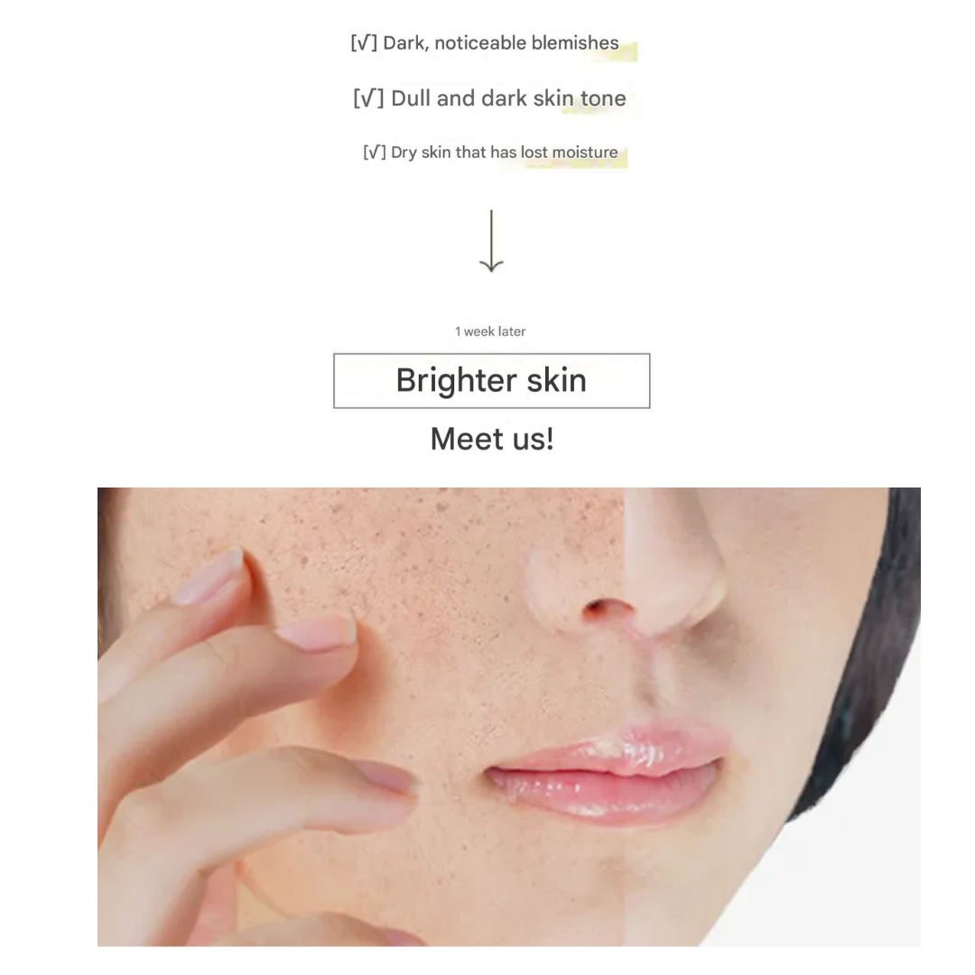 - Contains Glatathione, Vitamin E, and Ferulic Acid to boost the brightening effect and surpress melanin production.