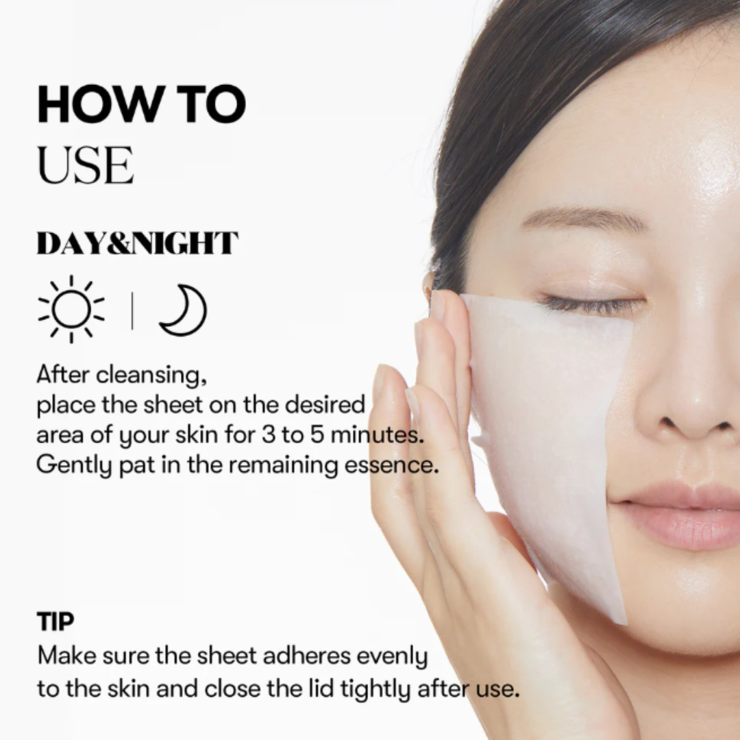 1. After cleansing and before applying makeup, open the cap, remove the sheet, and apply evenly on your skin.